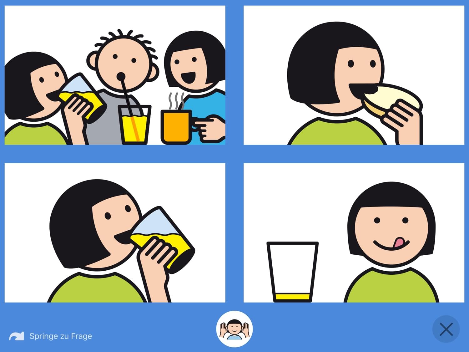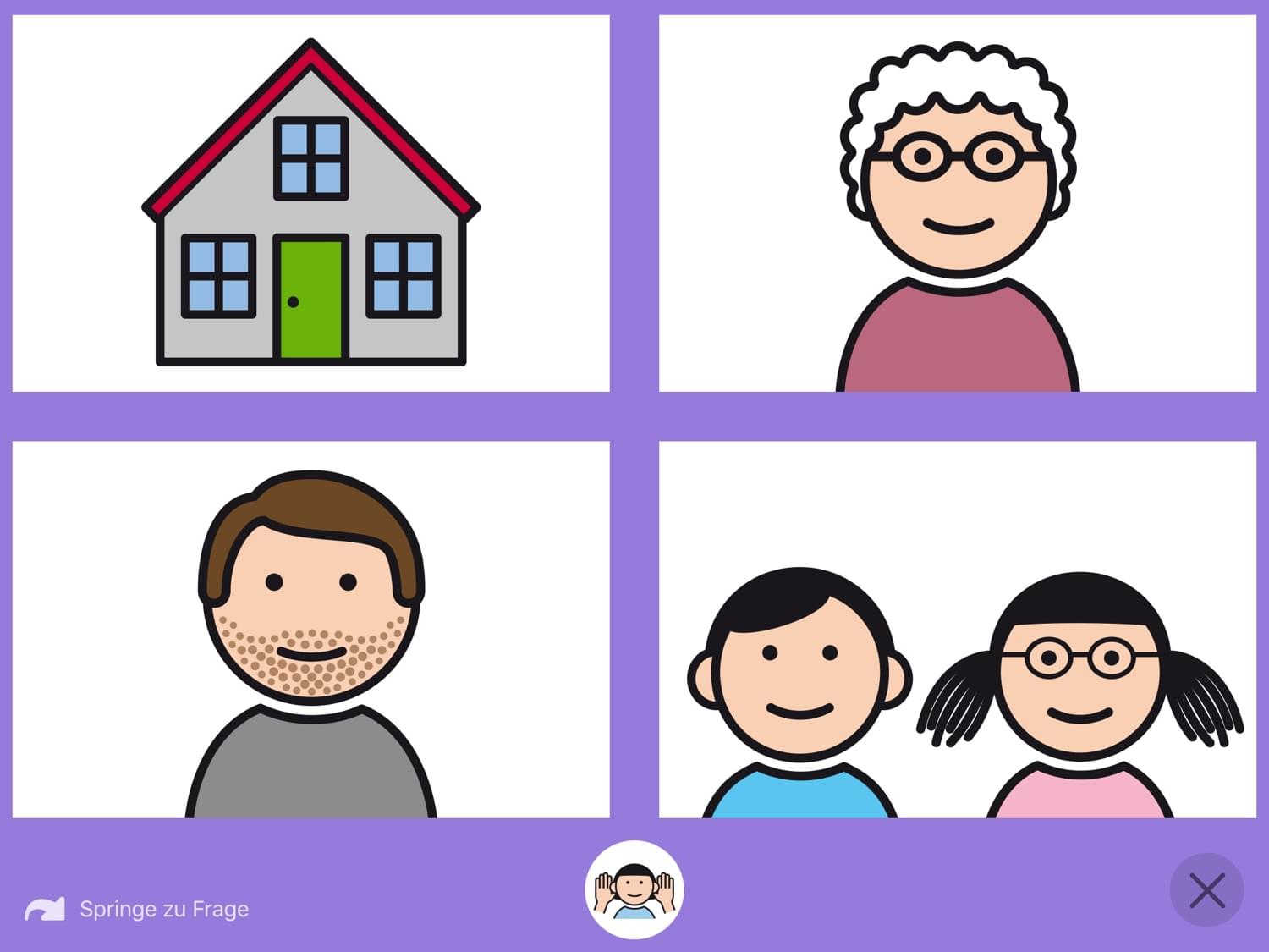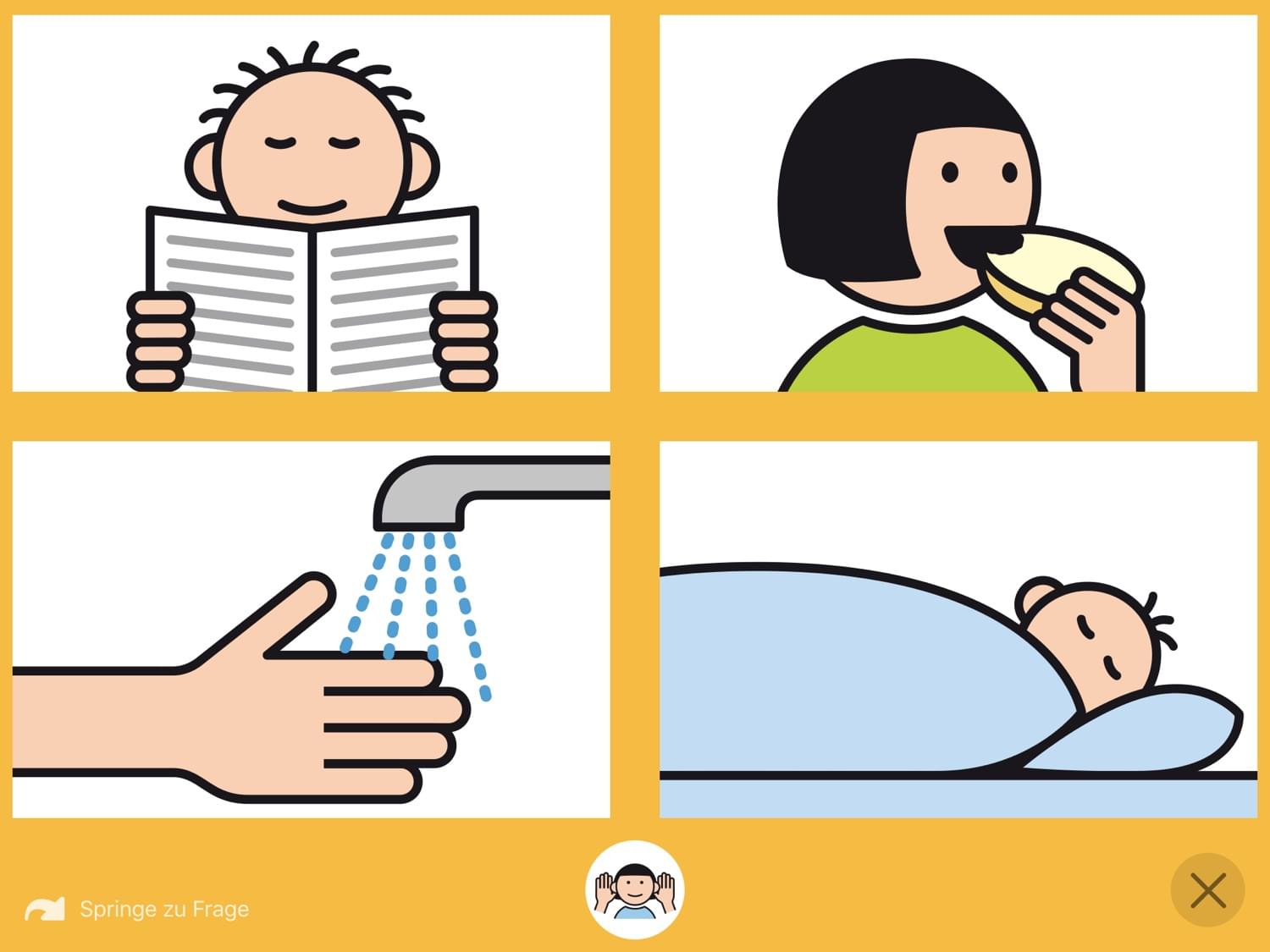 Tipp mal überprüft in etwa 70 Fragen semantische und syntaktische Fähigkeiten von einfachen Substantiven über Pluralfunktionen bis hin zu Konjugationen, vom situationsunabhängigen Verstehen von Wörtern über Satzstellung bis hin zum satzübergreifenden Sprachverstehen. Im Folgenden sehen Sie einzelne Fragen aus den verschiedenen Bereichen
