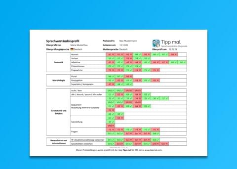Die Apps protokollieren während der Überprüfung automatisch die Fähigkeiten, die der Proband/die Probandin beim Beantworten der Fragen zeigt. Darüberhinaus werden im Protokoll Hinweise zum eigenen Sprachgebrauch und zum Einsatz Unterstützter Kommunikation gegeben. Unabhängig davon, welche Tipp mal-Verson Sie nutzen, können Sie sich bei der Überprüfung so viel Zeit lassen, wie Sie möchten und die Fragen wiederholen. Im Gegensatz zu herkömmlichen Testverfahren ist es sowohl erlaubt als auch erwünscht zu bestätigen, zu ermuntern und zu loben. Auch Ihre Beobachtungen rund um die Überprüfung fließen in die Einschätzung des Sprachverständnisses mit ein.